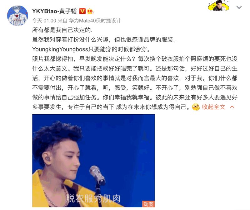 結果沒想到黃子韜很快就上線發文回復,發文表示:「所有都是我自己決定的。雖然我對穿著打扮沒什麽興趣,但也很感謝品牌的服裝。YoungkingYoungboss只要能穿的時候都會穿。照片我都懶得拍,早發晚發能決定什麽?每次換個破衣服拍個照麻煩的要死也沒什麽太大意義。我只要能把歌好好唱完了就可。