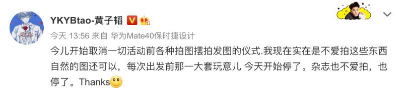 在17號下午,黃子韜再度發文表示:「今兒開始取消一切活動前各種拍圖擺拍發圖的儀式。我現在實在是不愛拍這些東西,自然的圖還可以,每次出發前那一大套玩意兒,今天開始停了。雜誌也不愛拍,也停了。Thanks[微笑] 」