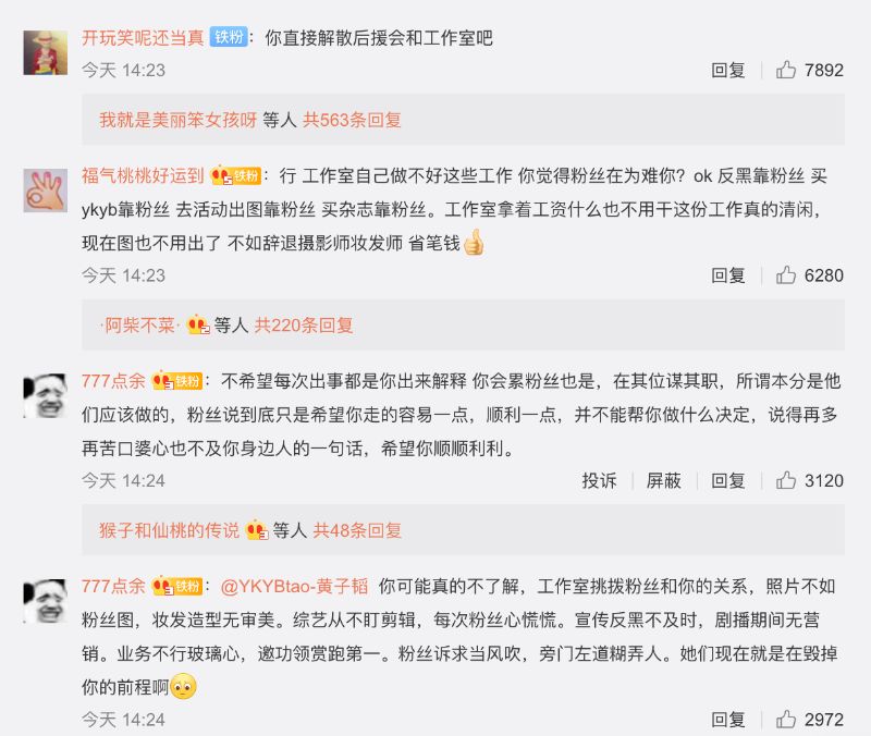 「行!工作室自己做不好這些工作,你覺得粉絲在為難你?ok 反黑靠粉絲,買ykyb靠粉絲,去活動出圖靠粉絲,買雜誌靠粉絲。工作室拿著工資什麽也不用幹,這份工作真的清閑,現在圖也不用出了,不如辭退攝影師妝髮師,省筆錢[贊]」