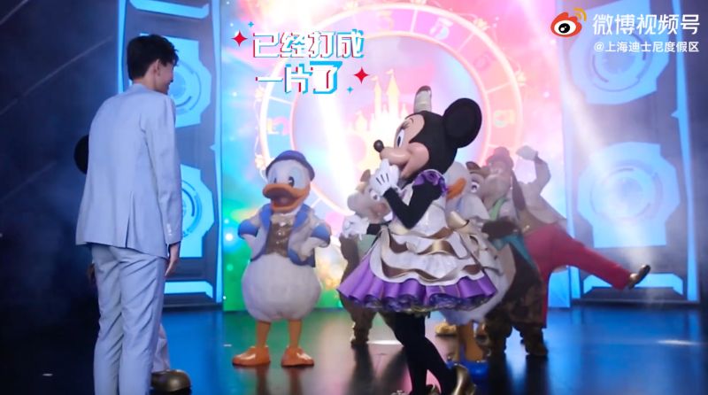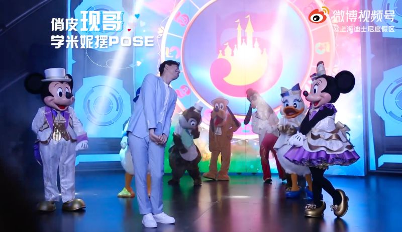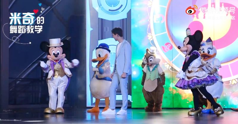 但鏡頭外,卻和迪士尼卡通人物打成一片!