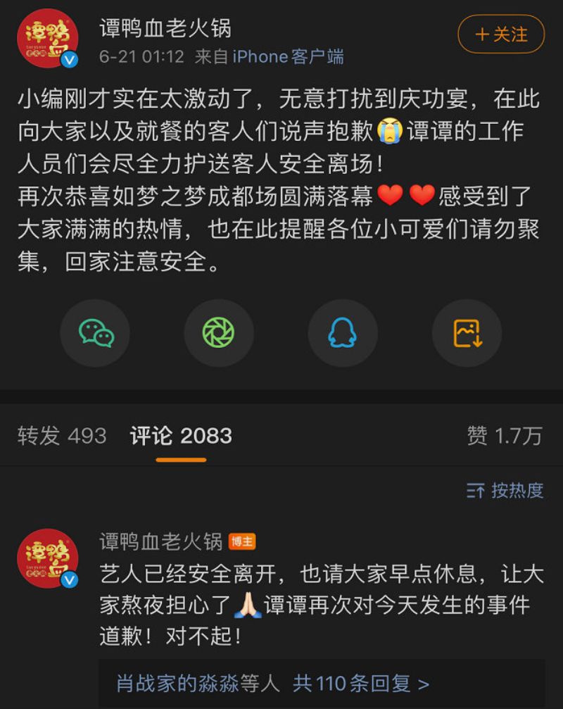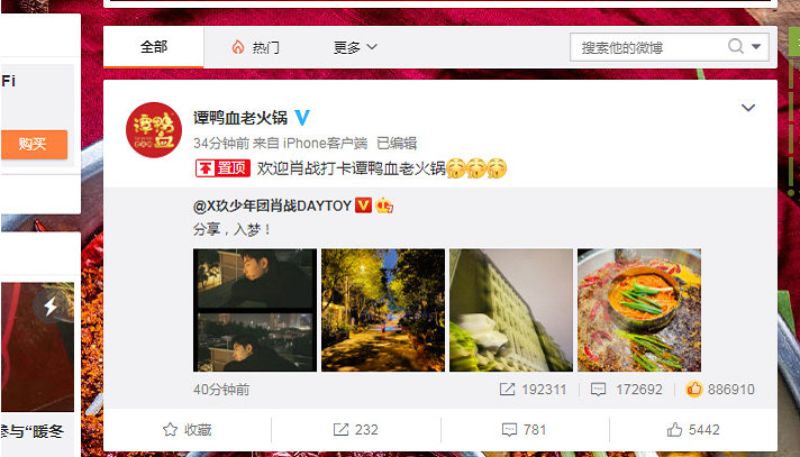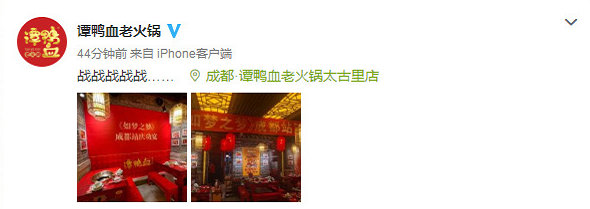 雖然如此,但沒想到慶功宴的地點卻被因此曝光了!千算萬算,都沒料到店家轉發了肖戰的微博,表示:「歡迎肖戰打卡譚鴨血老火鍋。」