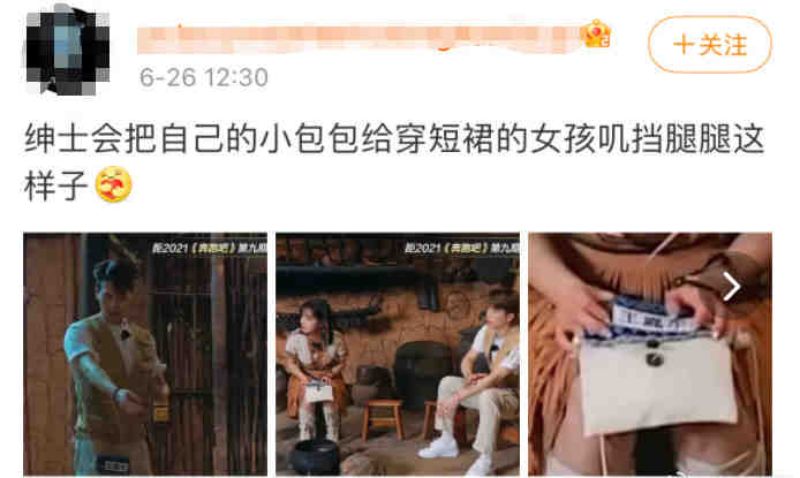 粉絲也發現了另一個嘎嘎超圈飯舉動,那就是拿自己的小包包給穿短裙的女孩擋腿。