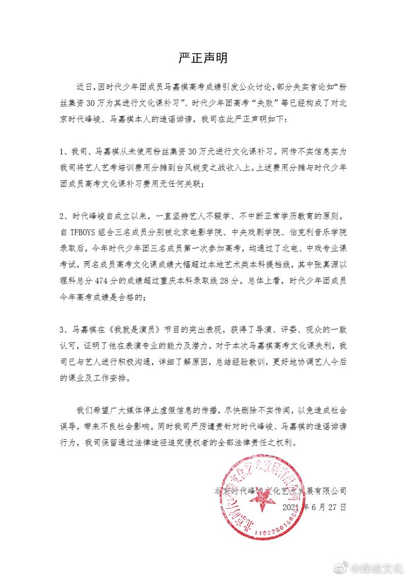 時代峰峻於27號晚上發聲明,一一整理回應網絡傳聞,當中提到「馬嘉祺用粉絲集資30萬進行文化課補習」說法不實,從未發生此行為。