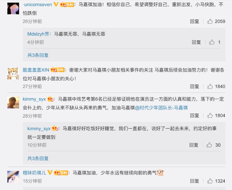 當然更多的是粉絲為馬嘉祺送上支持的鼓勵!「馬嘉祺加油!相信你自己,希望調整好自己,重新出發,小馬快跑,不怕跌倒!」、「謝謝大家對馬嘉祺小朋友相關事件的關注 馬嘉祺後續會加油努力的!謝謝各位對馬嘉祺小朋友的關心!」、「馬嘉祺中戲藝考第6名已經足夠證明他在演員這一方面的認真和能力,落下的一定會補上的,少年從來不缺從頭再來的勇氣,加油馬嘉祺!」、「馬嘉祺好好吃飯好好睡覺,我們一直都在,說好了一起去未來,約定好的事就一定要做到!」、「馬嘉祺加油,少年永遠有繼續向前的勇氣!」