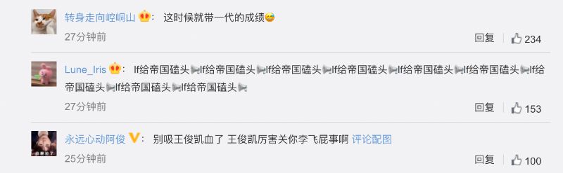 「提tfboys幹嘛?」、「滾!少提他爹TFBOYS,他還有臉提呢!」、「這時候就帶一代的成績😅」、「lf給帝國磕頭📢lf給帝國磕頭📢lf給帝國磕頭📢lf給帝國磕頭📢lf給帝國磕頭📢lf給帝國磕頭📢lf給帝國磕頭📢lf給帝國磕頭📢lf給帝國磕頭📢」、「別吸王俊凱血了 王俊凱厲害關你李飛屁事啊!」