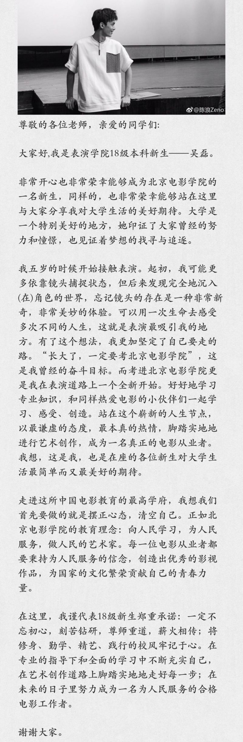 吳磊常被戲稱是「北電人,北電魂」,從他私下常穿著北電衣服來看,他真的很喜歡自己的大學啊!最後送上吳磊18年新生代表時的發言,據說至今還是很多學弟妹必看的一篇講詞呢!
