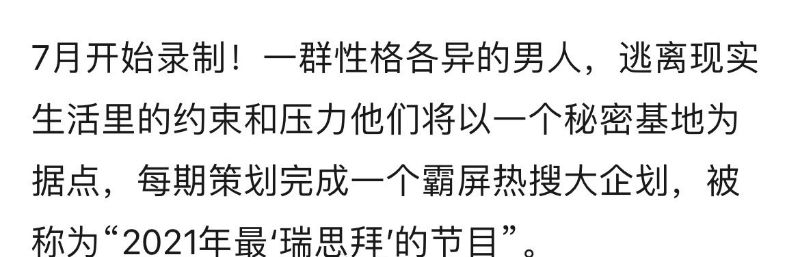 這檔節目暫定在下半年週六黃金檔播出,7月開始錄製,主要是邀請一群性格各異的男人,逃離現實生活裡的約束和壓力,將以一個秘密基地為據點,每期策劃完成一個霸屏熱搜大企劃!