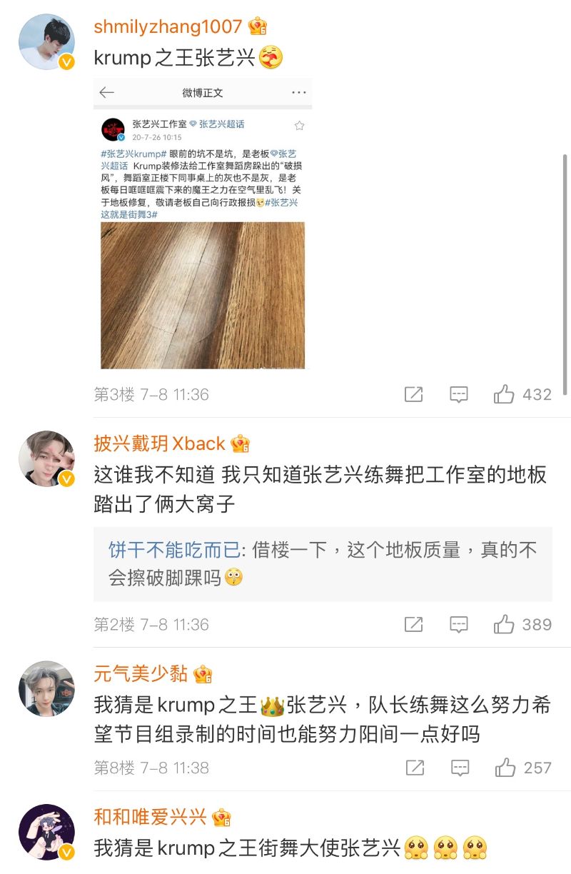 把地板都踩破了,你說還有誰有這個能耐?應該就是我們去年把練習室地板都踩破了的Krump魔王張藝興吧!果然一抵達上海就開啟了練舞模式啊!