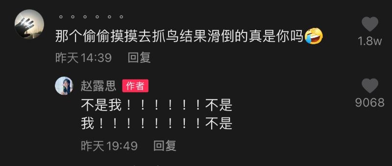 立刻就有粉絲去趙露思抖音下發問:「那個偷偷摸摸去捉鳥結果滑倒的真是你嗎?」,當時肉絲就回復:「不是我!!!!!!不是我!!!!!!!!不是」這麼多感歎號,隔著熒幕都感受到了她的強烈否認啊!