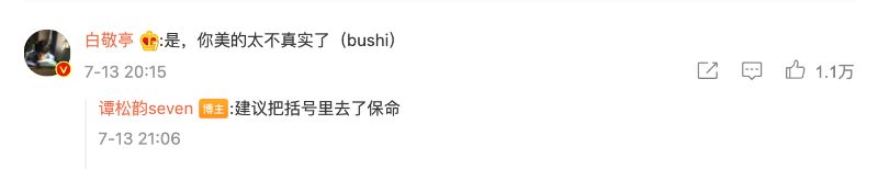 聽見譚松韻說模特比較美,小白立刻跑來留言表示:「是,你美的太不真實了(bushi)」但後面附加了一句bushi,這就…果然立刻被韻姐霸氣回懟:「建議把括號裡去了保命!」哈哈哈哈哈哈哈哈哈哈!果然,能這麼對小白的,真的只有譚松韻啊!