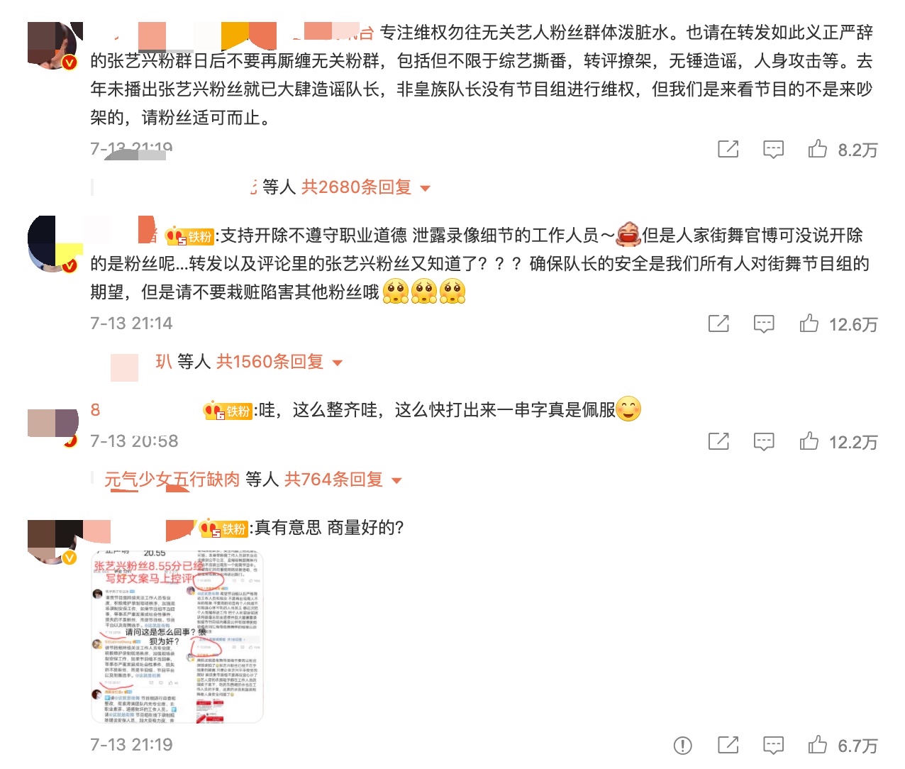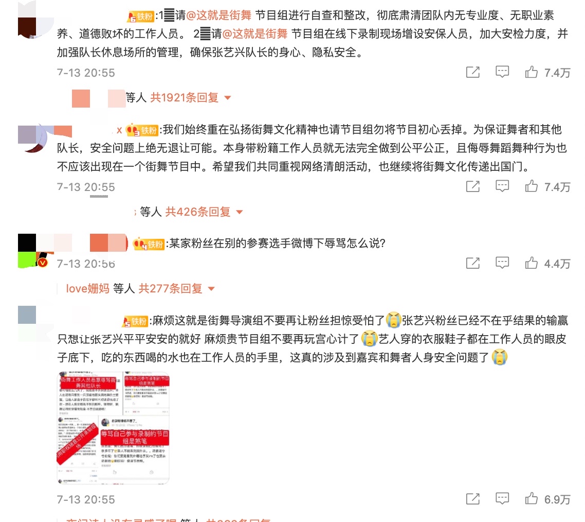 「麻煩這就是街舞導演組不要再讓粉絲擔驚受怕了[淚]張藝興粉絲已經不在乎結果的輸贏 只想讓張藝興平平安安的就好 麻煩貴節目組不要再玩宮心計了[淚]藝人穿的衣服鞋子都在工作人員的眼皮子底下,吃的東西喝的水也在工作人員的手裏,這真的涉及到嘉賓和舞者人身安全問題了!」