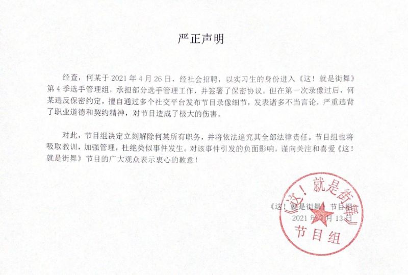 果然,《這!就是街舞》從第一季到第四季,可以說每一季都有很多爭議性啊!13號晚上,《這!就是街舞》節目方發表聲明,表示有一位何姓實習生在節目錄制期間違反保密協議,在第一次錄像過後,擅自發布節目錄像細節,發表諸多不當言論。節目組決定解除其所有職務,並將依法追究其法律責任,同時對該事件引發的負面影響向觀衆致歉。