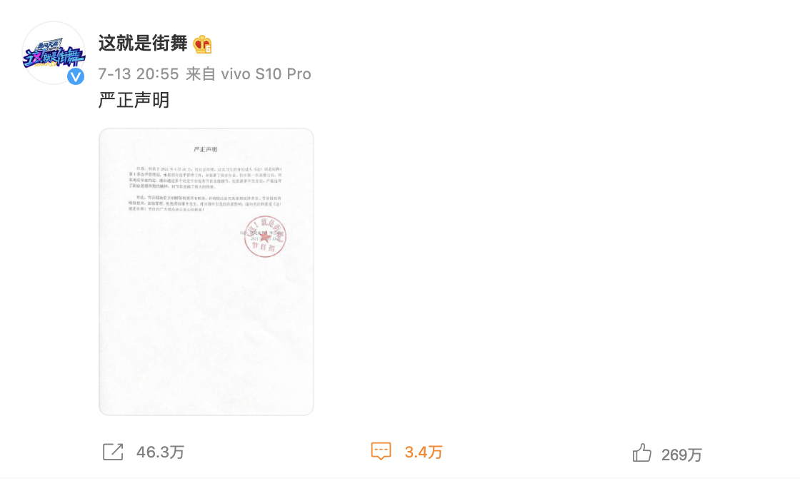 「我們始終重在弘揚街舞文化精神也請節目組勿將節目初心丟掉。為保證舞者和其他隊長,安全問題上絕無退讓可能。本身帶粉籍工作人員就無法完全做到公平公正,且侮辱舞蹈舞種行為也不應該出現在一個街舞節目中。希望我們共同重視網絡清朗活動,也繼續將街舞文化傳遞出國門。」