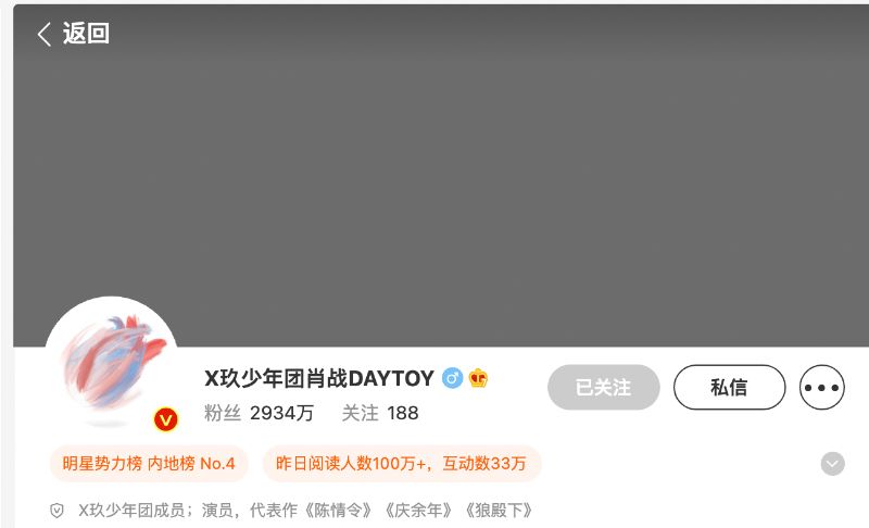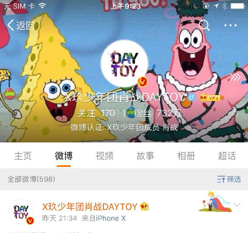 肖戰的微博出道至今沒換過海綿寶寶的版頭,從700多萬粉絲到後來突破2000萬,一直都使用海綿寶寶和派大星的照片。不過自從被網暴事件之後,才把版頭換成了全灰色。