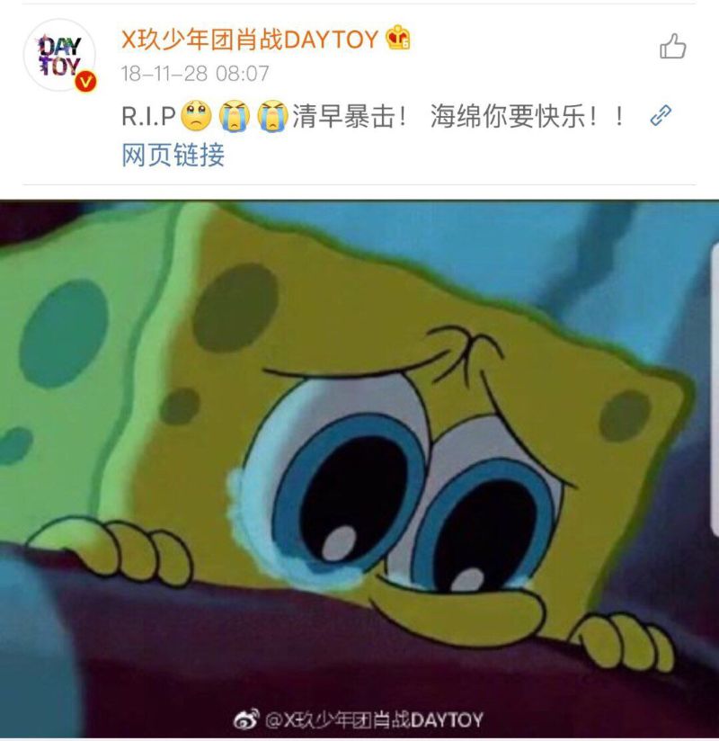 在海綿寶寶作者去世那天,一大早就發了微博安慰海綿寶寶:「R.I.P😭😭清早暴擊!海綿你要快樂!!」配圖讓人很想哭!
