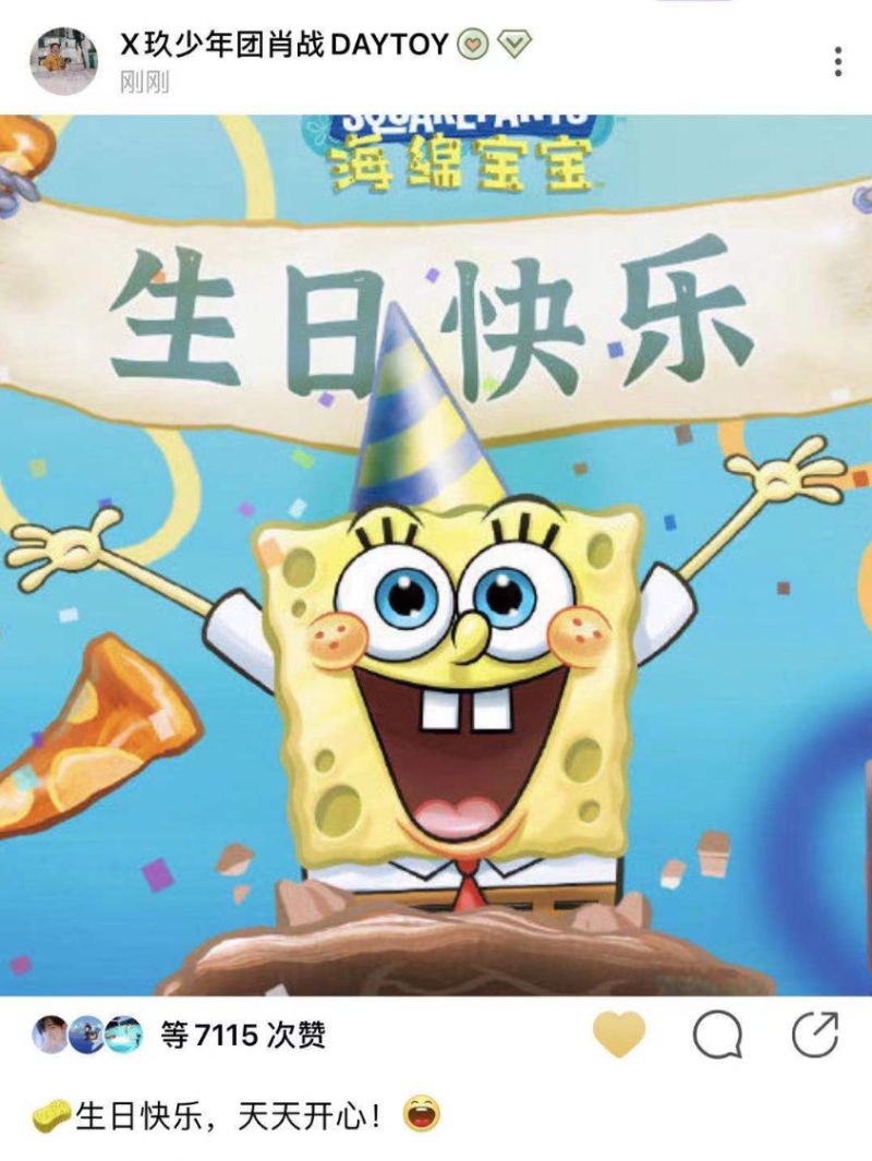 海綿寶寶生日快樂!!!!!!沒錯!7月14日是卡通人物海綿寶寶的35歲生日快樂,在它生日的這一天,鐵粉肖戰也特別發博為它送上生日祝福!!!