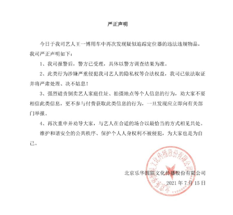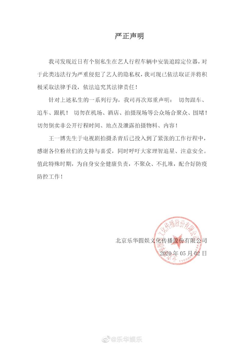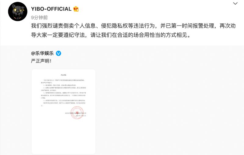 樂華聲明中“強烈譴責倒賣藝人家庭住址、拍攝地點等個人信息的行為”,希望大家,“與藝人在合適的場合以最恰當的方式相見共處”。