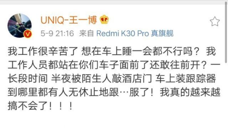 裝定位器之後的一個星期,甚至發生私生直接用車企圖撞阻擋去路的工作人員的舉動,導致王一博直接發文怒斥!