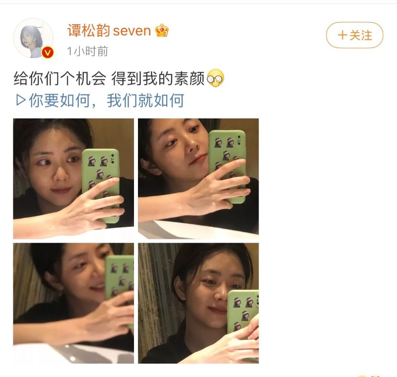 而近日她更新了微博,直接放出了4張素顏懟臉自拍!配文:「給你們個機會,得到我的素顏。」