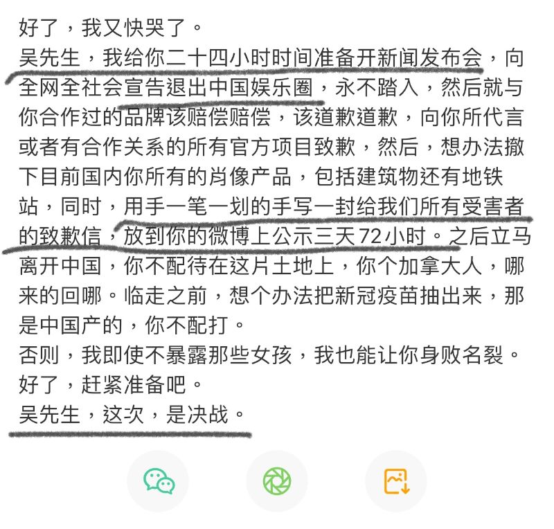 吳先生,我給你二十四小時時間準備開新聞發布會,向全網全社會宣告退出中國娛樂圈,永不踏入,然後就與你合作過的品牌該賠償賠償,該道歉道歉,向 你所代言或者有合作關係的所有官方項目致歉,然後,想辦法撤下目前國內你所有的肖像產品,包括建築物還有地鐵站,同時,用手一筆一劃的手寫一封給我們所有 受害者的致歉信,放到你的微博上公示三天72小時。 之後立馬離開中國,你不配待在這片土地上,你個加拿大人,哪來的回哪。 臨走之前,想個辦法把新冠疫苗抽出來,那是中國產的,你不配打。