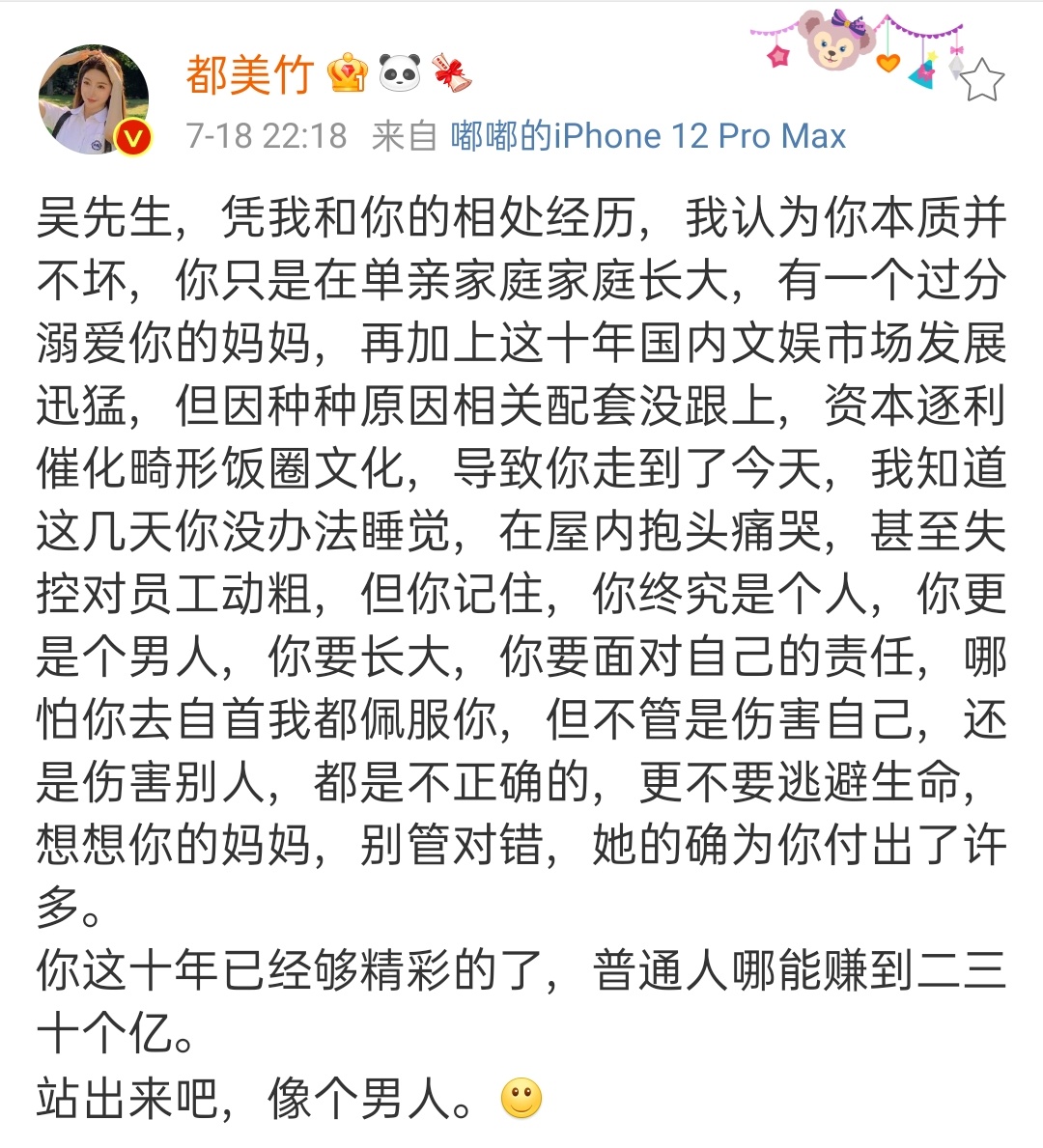 隨後都美竹再發文喊話吳亦凡:「吳先生,憑我和你的相處經歷,我認為你本質並不壞,你只是在單親家庭家庭長大,有一個過分溺愛你的媽媽,再加上這十年國內文娛市場發展迅猛,但因種種原因相關配套沒跟上,資本逐利催化畸形飯圈文化,導致你走到了今天,我知道這幾天你沒辦法睡覺,在屋內抱頭痛哭,甚至失控對員工動粗,但你記住,你終究是個人,你更是個男人,你要長大,你要面對自己的責任,哪怕你去自首我都佩服你,但不管是傷害自己,還是傷害別人,都是不正確的,更不要逃避生命,想想你的媽媽,別管對錯,她的確為你付出了許多。