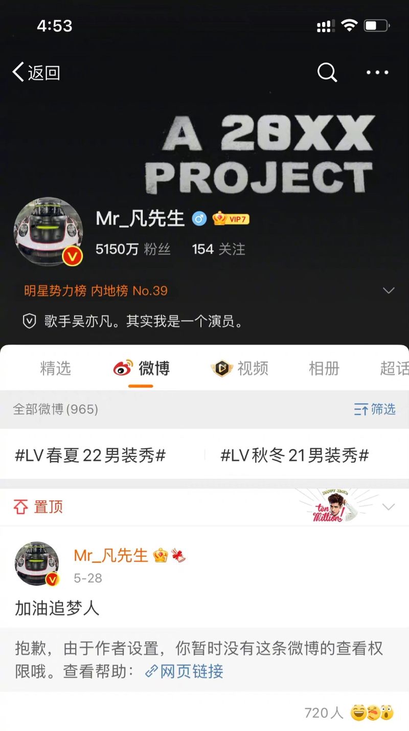 目前這則貼文已經被「央視新聞」設置了權限,也就是另類刪帖的意思啦!所以目前點進吳亦凡微博,置頂的貼文成了下面這個樣子👇 是說工作室都不提醒自家老闆一下嗎?這樣還置頂真的好看嗎?