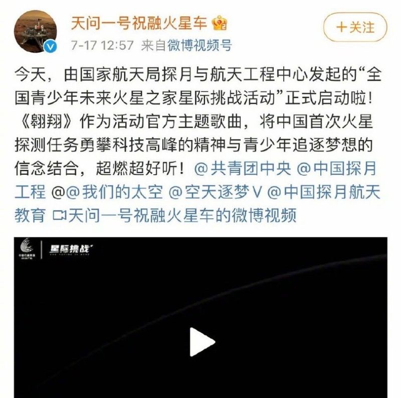 再來就是7月17號,官方「天問一號祝融火星車」官博也官宣了吳亦凡《翱翔》為官方主題曲,並艾特了一堆官方賬號,十分有面子!