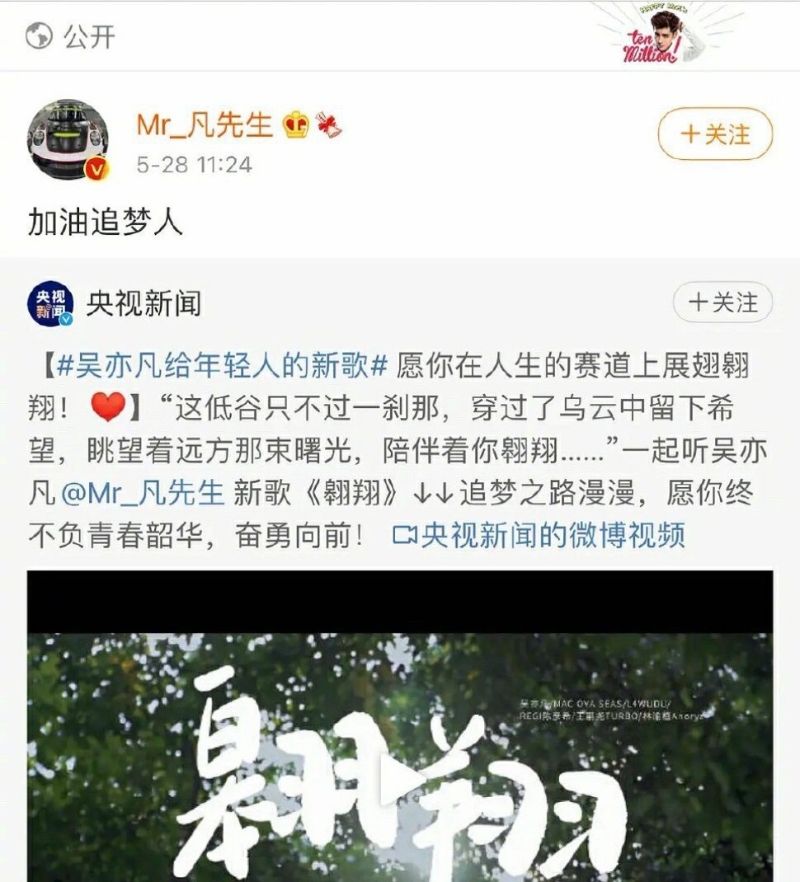 雖然工作室沒反應,但網友發現其他第三方似乎都在採取行動了!首先,官媒「央視新聞」曾在5月28日發了吳亦凡新歌《翱翔》的MV,並帶了話題「#吳亦凡給年輕人的新歌#」這則新聞被吳亦凡轉發,並置頂在自己的微博。