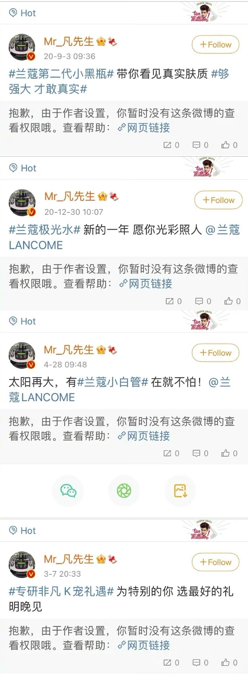 目前吳亦凡微博內有關蘭蔻的貼文,被已經沒辦法查看。