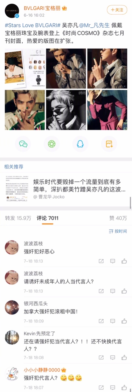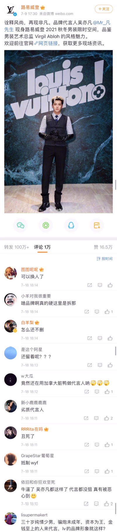 而吳亦凡身為代言人的LV官博,也被洗版!