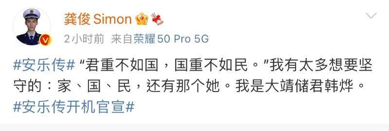 也來看看兩人的官宣詞!龔俊的是:「”君重不如國,國重不如民。”我有太多想要堅守的:家、國、民,還有那個她。我是大靖儲君韓烨。」
