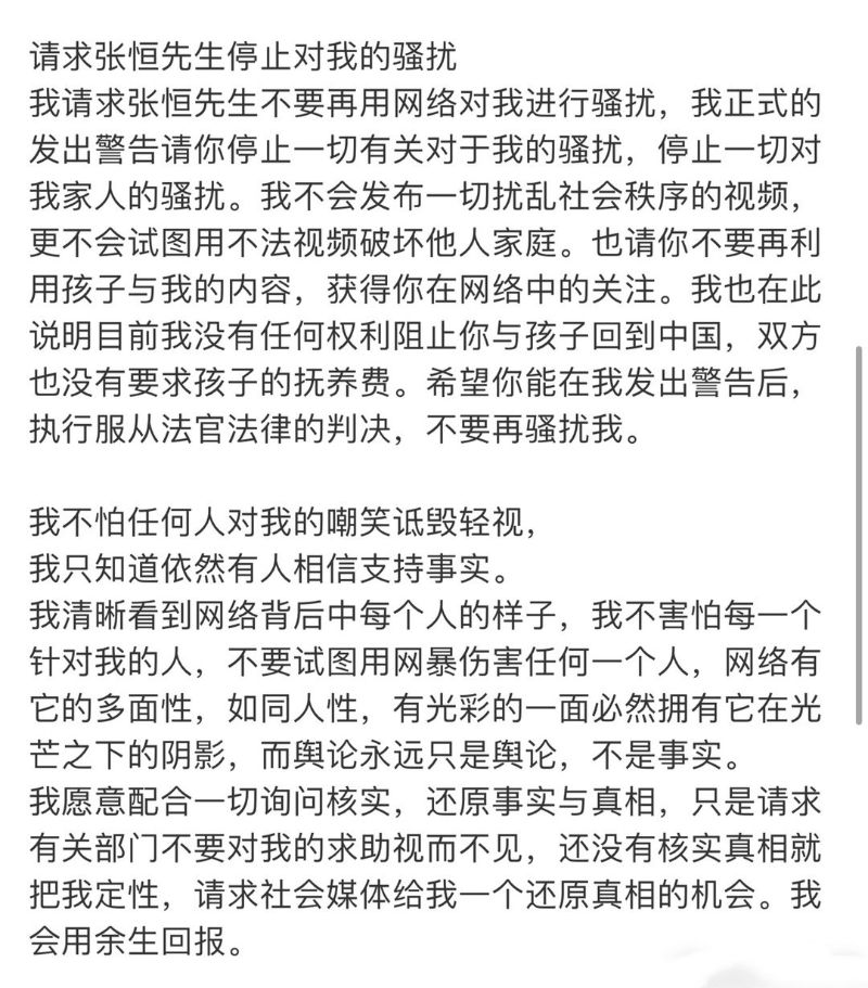我請求張恒先生不要再用網絡對我進行騷擾,我正式的發出警告請你停止一切有關對于我的騷擾,停止一切對我家人的騷擾。我不會發布一切擾亂社會秩序的視頻,更不會試圖用不法視頻破壞他人家庭。也請你不要再利用孩子與我的內容,獲得你在網絡中的關注。我也在此說明目前我沒有任何權利阻止你與孩子回到中國,雙方也沒有要求孩子的撫養費。希望你能在我發出警告後,執行服從法官法律的判決,不要再騷擾我。