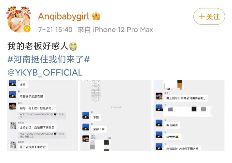 但讓人更感動的是,21號下午,黃子韜旗下服飾品牌YKYB的員工發博,表示:「我的老闆好感人😭」