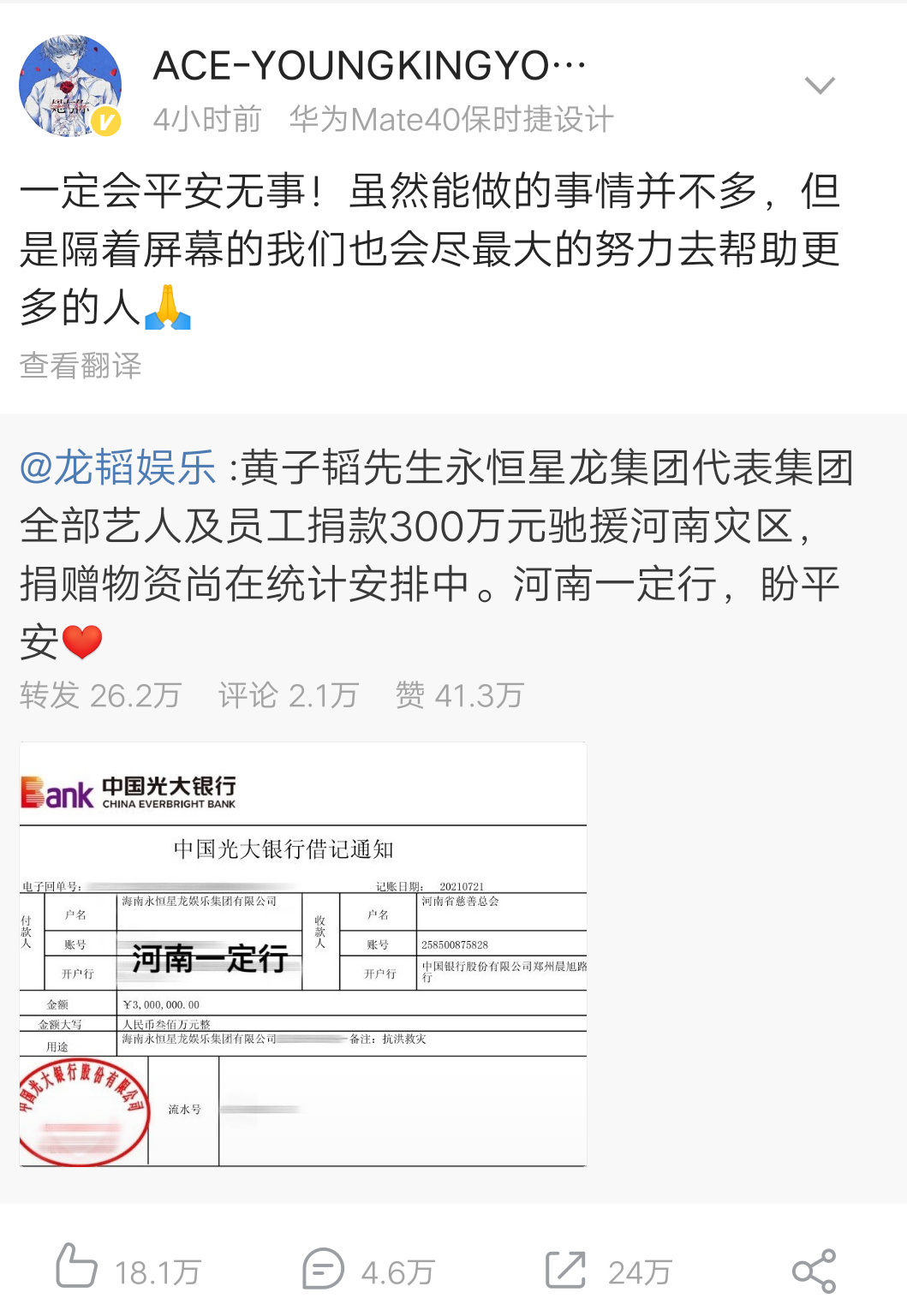 當中黃子韜不但是最早一批捐款的藝人,更是一捐就捐出300萬!