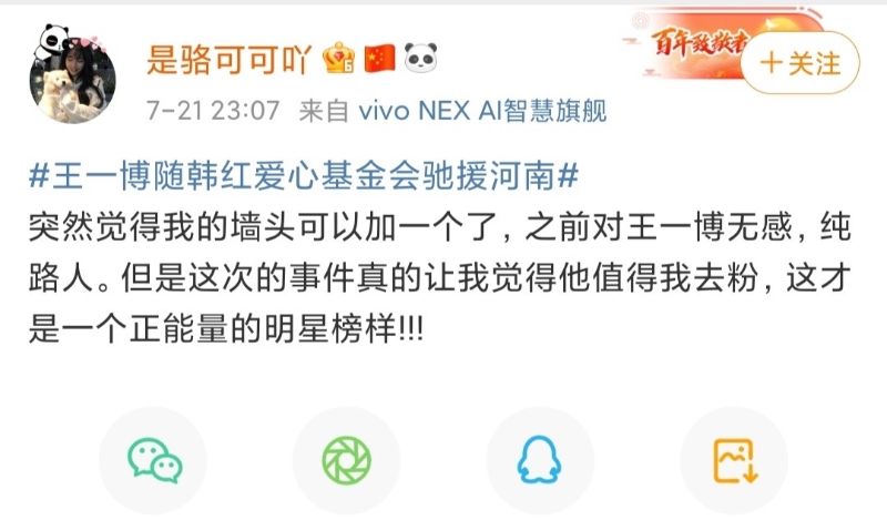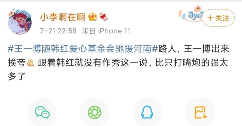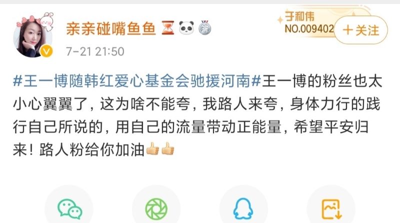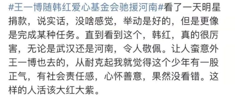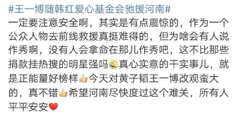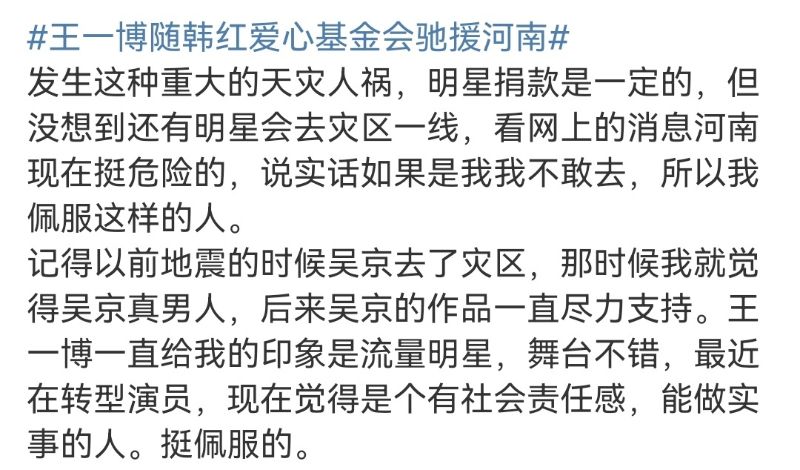 但沒想到原來王一博不但有捐款,甚至還作為韓紅慈善基金會的明星志願者,下午帶著物資和專業救助人員前往鄭州救災!如果不是韓紅基金會發出來,根本就沒人知道這個頂流已經推掉所有工作,直接上前線身體力行幫忙了!新聞詳情》正能量!王一博跟隨韓紅救援隊上河南前線救災!只做不說就是王一博!