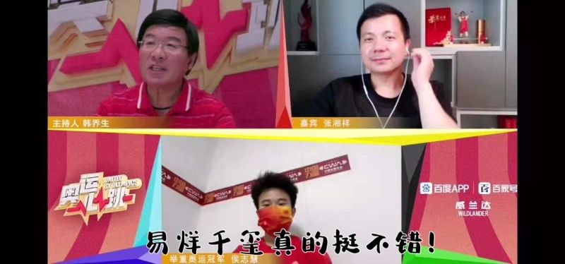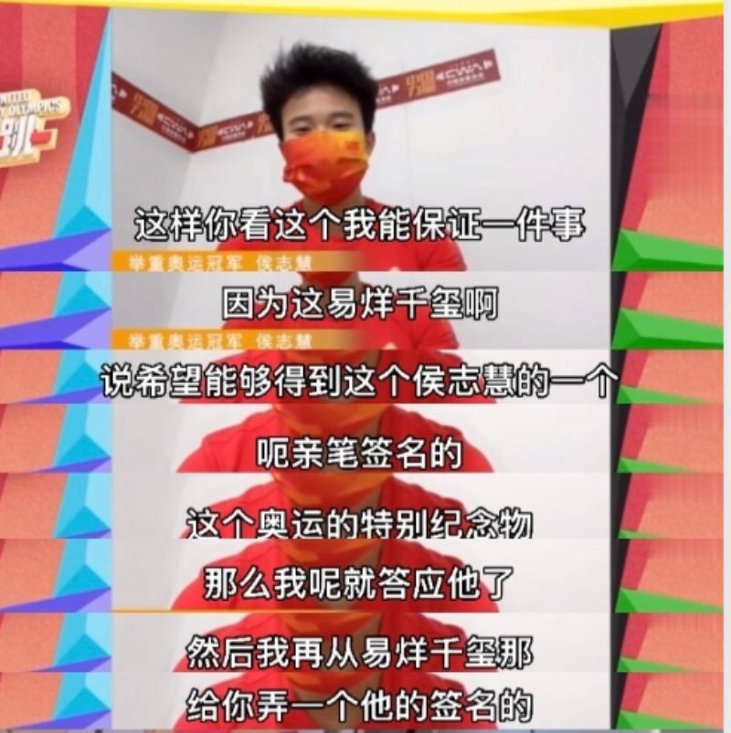 這時負責連線的韓喬生老師才說出,原來易烊千璽也很欣賞候志慧!韓老師:「易烊千玺說想要一個侯志慧親筆簽名的奧運紀念物,我再從易烊千玺那兒弄個他親筆簽名的,他現在在深圳拍電影,到時候我把這個事辦了,之後我們再來個直播。」