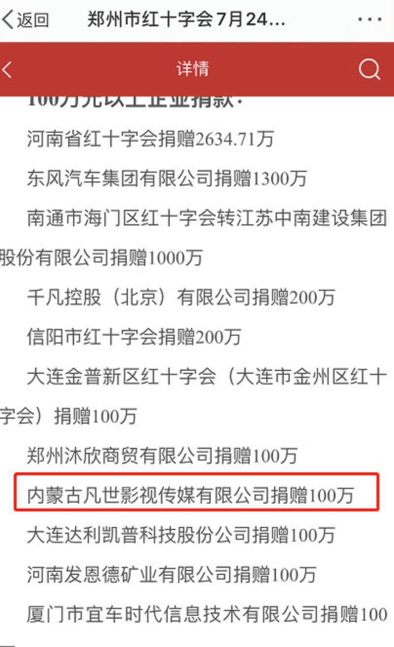 隨後媒體也在25號公布的“7月24日接收社會捐款第三批資金分配去向及大額捐款公示”的列表中,發現了由吳亦凡表哥吳林擔任法定代表人的“內蒙古凡世影視傳媒有限公司”名字,捐贈了100萬元。