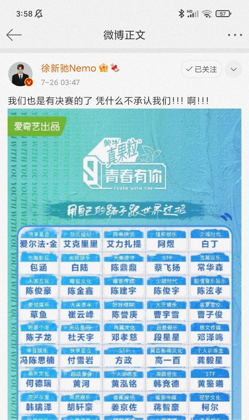 最後是合理懷疑是切錯號的徐新馳,因為發了之後就刪帖了,但也看得出清人們有多激動!!!徐新馳貼出了《青春有你3》的訓練生名字,並寫道:「我們也是有決賽的了,拼什麼不承認我們!!!啊!!!」隔著熒幕也感受到他的激動!
