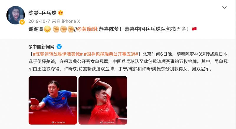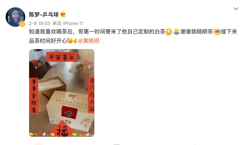 2020年,陳夢在卡達爾公開賽奪下女單冠軍,黃曉明照例發文,還遭到陳夢吐槽選用的照片不合格!哈哈哈~