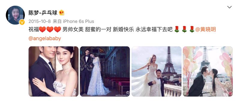 在陳夢的微博,看得出和表哥的感情不錯,時常都有互動,黃曉明和Angelababy結婚時,陳夢也有發微博祝賀。