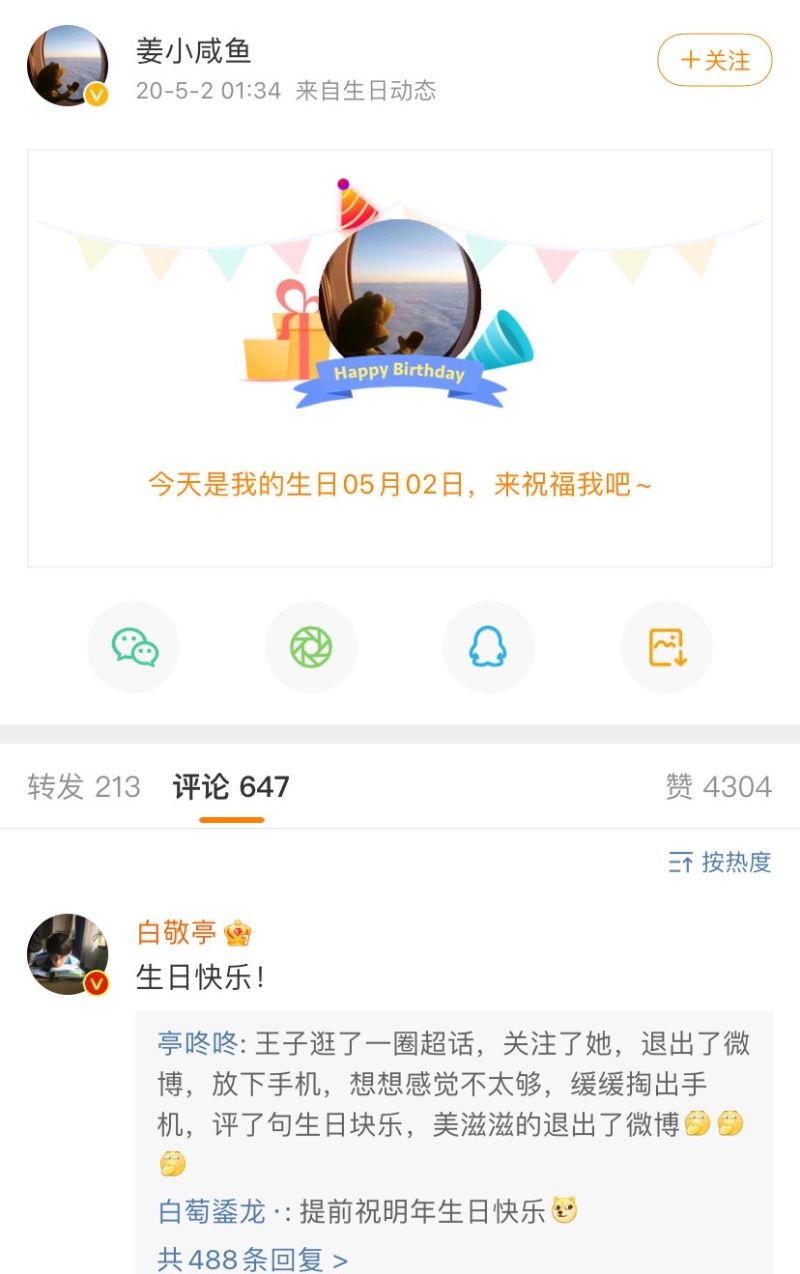 於是我們的小白不但關注了她,連點讚3則微博,甚至還在她2020年的生日快樂帖下,提前送上生日祝福!嗚呼~慕了慕了!