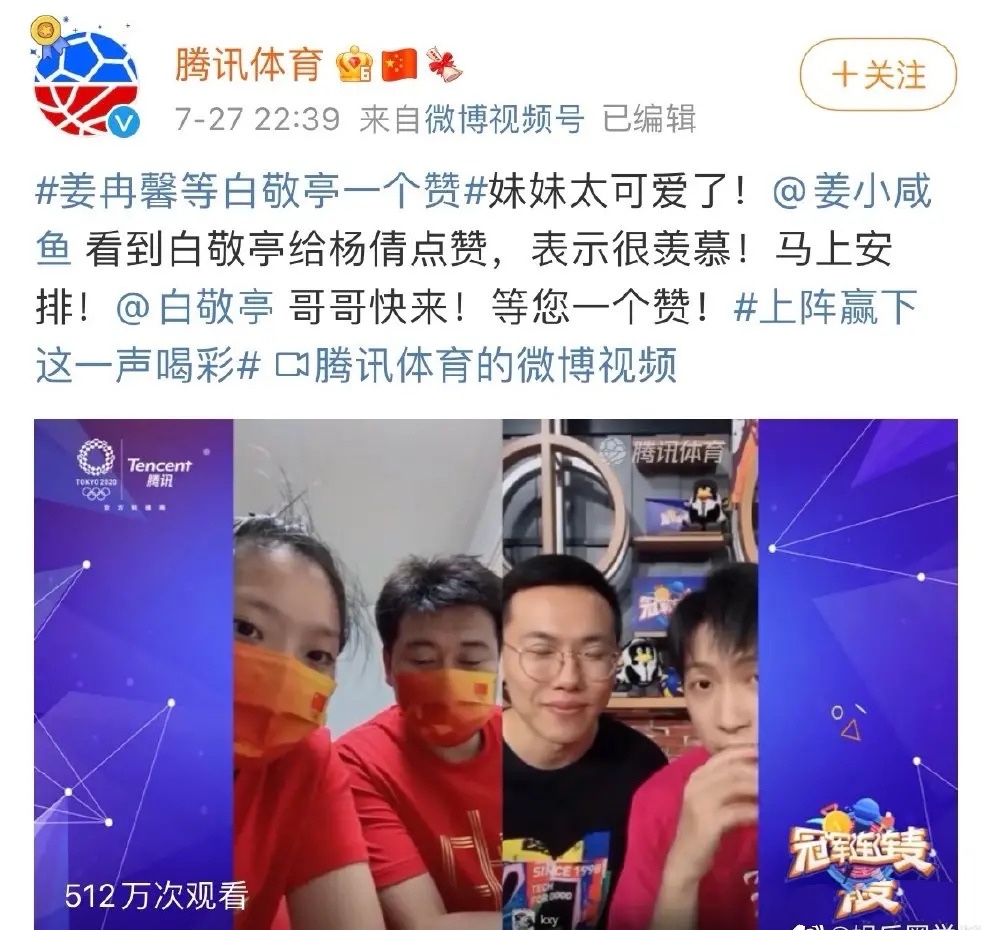 隔著熒幕都能感受到白敬亭的驕傲啦!哈哈哈!沒錯!又是另一個喜歡白敬亭的金牌得主,我們小白真的實名很火啊!在發現小白和隊友楊倩連線互動之後,21歲的姜冉馨也喊話希望得到小白點讚!