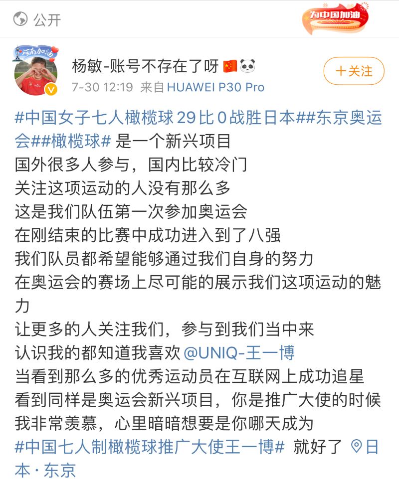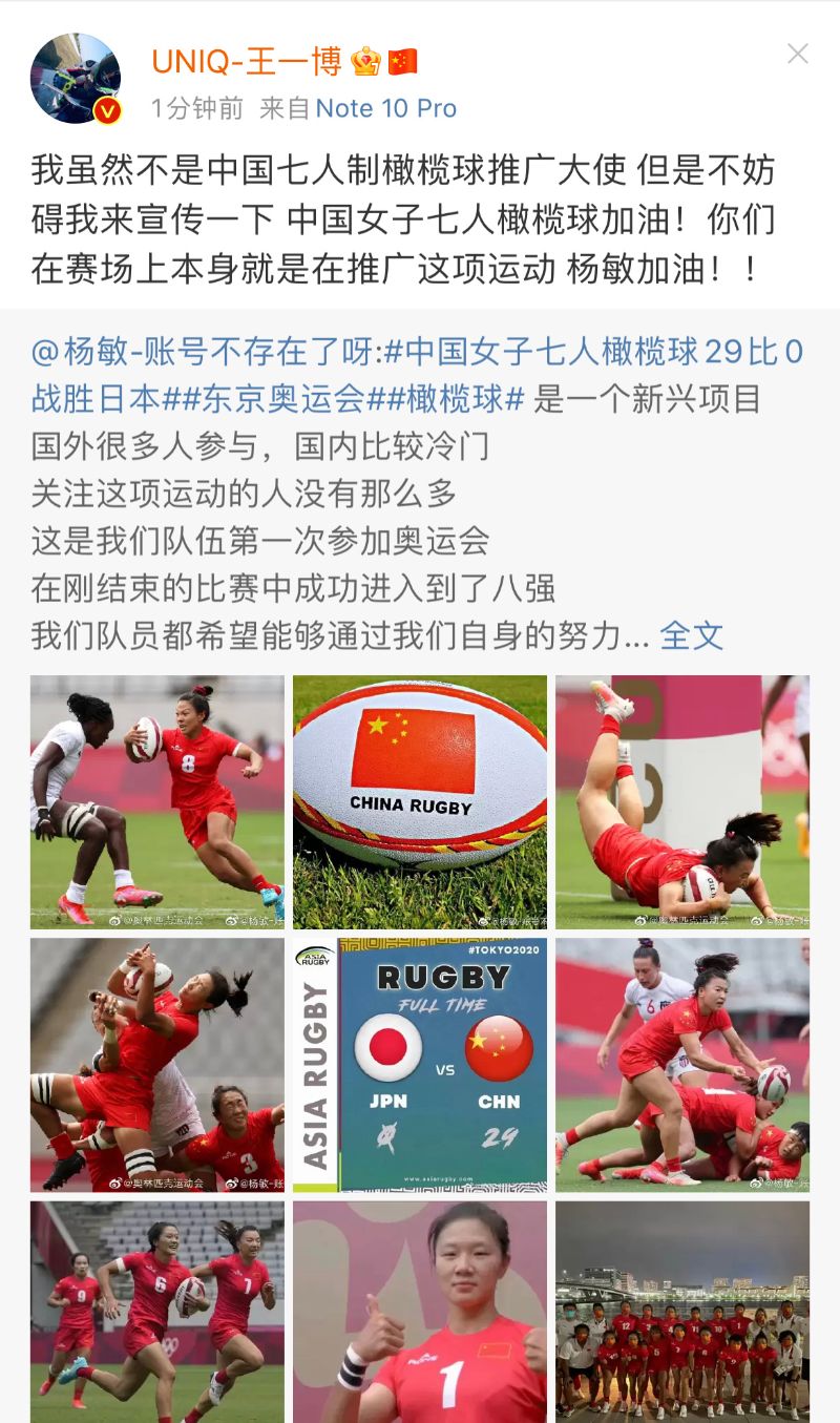 原以為王一博頂多就來點個讚,但沒想到甚少發微博的王一博,居然轉發了楊敏的微博,並寫道:「我雖然不是中國七人制橄榄球推廣大使,但是不妨礙我來宣傳一下中國女子七人橄榄球加油!你們在賽場上本身就是在推廣這項運動,楊敏加油!!」