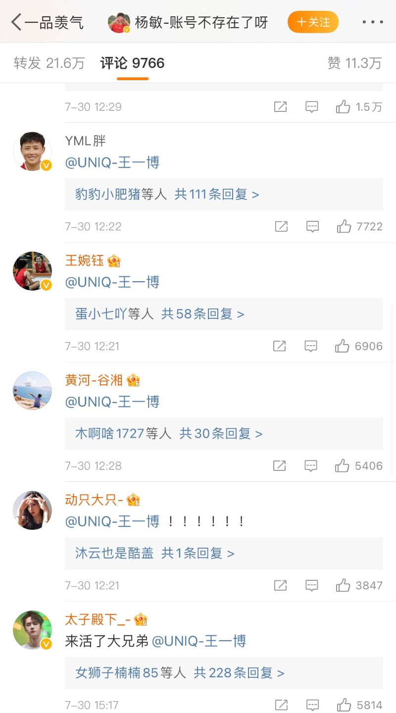 於是同隊的隊友們,紛紛在楊敏的微博下艾特,呼喚正主王一博!