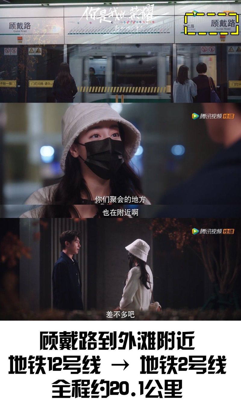 在光棍節,于途結束和同事聚會時,特地回去帶晶晶去看電影。喬晶晶問聚會地方很靠近嗎?于途說差不多,但從鏡頭拍到的地鐵站細節來看,同學聚會的地點在顧戴路附近,而晶晶家在外灘,20公里的路程!!
