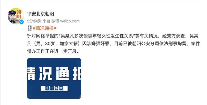 北京警方通報全文:「針對網絡舉報的“吳某凡多次誘騙年輕女性發生性關係”等有關情況,經警方調查,吳某凡(男,30歲,加拿大籍)因涉嫌強姦罪,目前已被朝陽公安分局依法刑事拘留,案件偵辦工作正在進一步開展。」