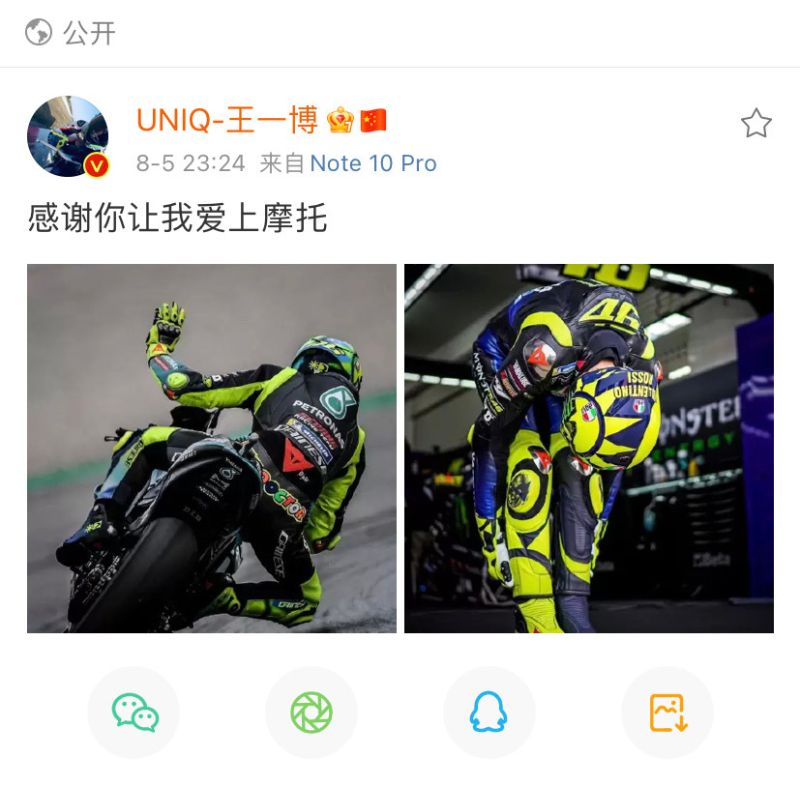 我們的王一博微博除了廣告貼文,出現最多的主人公,真的就是這位影響王一博很深的MotoGP傳奇人物:羅西!甚至連520和情人節,都強行讓羅西陪自己過!果然是追星族都會做的事情啊!