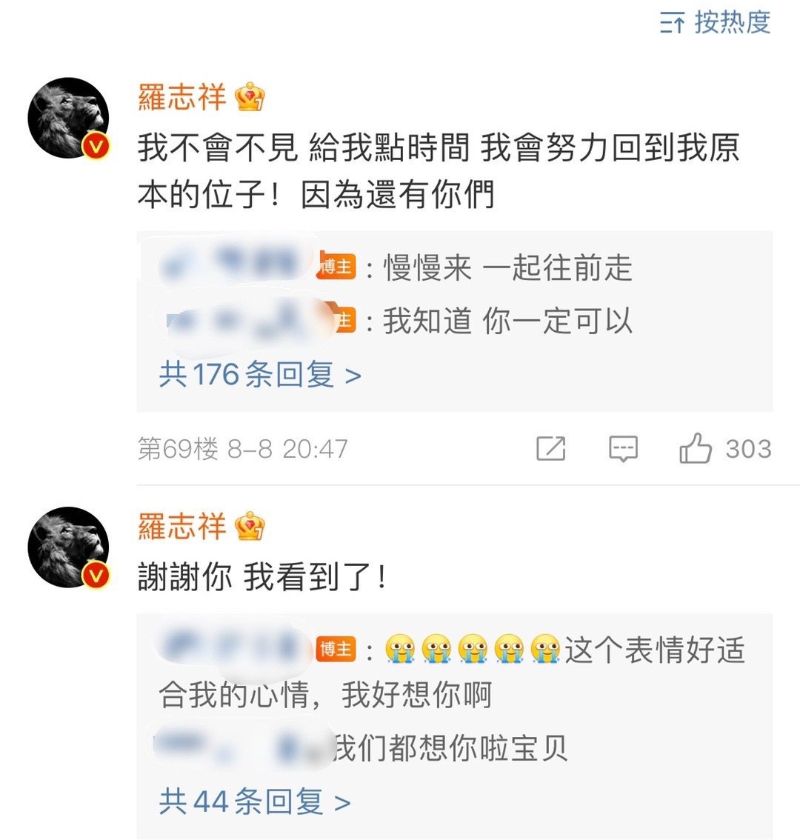 但最新他在回復粉絲留言時,喊話表示:「我不會不見,給我點時間,我會努力回到我原本的位子!因為還有你們!」而粉絲則回復表示:「慢慢來,一起往前走!」、「我知道,你一定可以!」