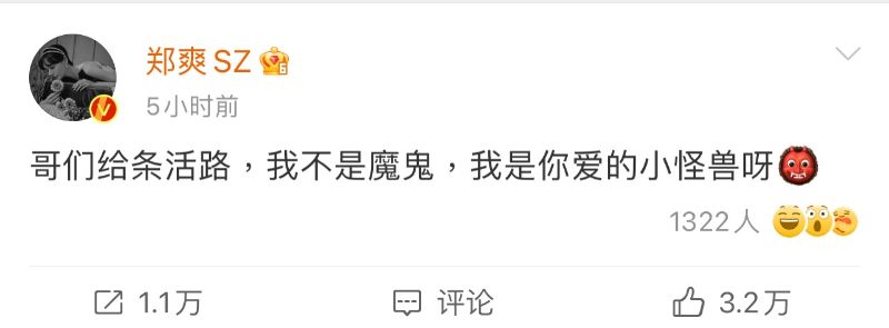 至於鄭爽,則是在微博發文,表示:「哥們給條活路,我不是魔鬼,我是你愛的小怪獸呀!」