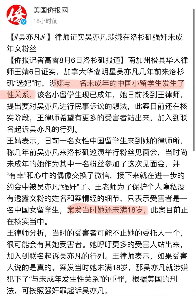 而10號,根據僑報網報道,有美國律師表示吳亦凡的確在洛杉矶涉嫌強奸一位粉絲,這位受害人是中國留學生,案發時不滿18歲,現在已經成年,並打算對吳亦凡提起訴訟 。